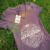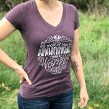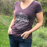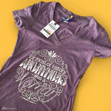 • White ink printed on premium Next Level Tri-Blend women's V-neck t-shirts in vintage purple