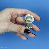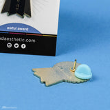 36mm hard enamel pin with gold metal edging comes with rubber clutch and backing card.