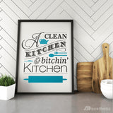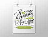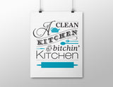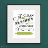 Rhymes are never offensive, right? :) This poster came to life after an office encounter, when I cleaned the community kitchen and then wrote a sunny little whiteboard note that said “A clean kitchen is a happy kitchen!” Some wise-guy decided to replace “happy” with “bitchin” and it had such a nice ring to it that I was inspired to make it into a poster for you to enjoy too.